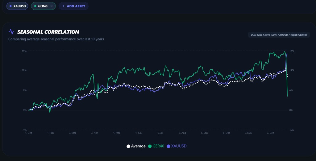 Nutze den Asset-Vergleich, um Korrelationen und Divergenzen in saisonalen Mustern zu identifizieren. Finde heraus, welches Asset in der aktuellen Phase die höchste statistische Wahrscheinlichkeit für einen Trend bietet.